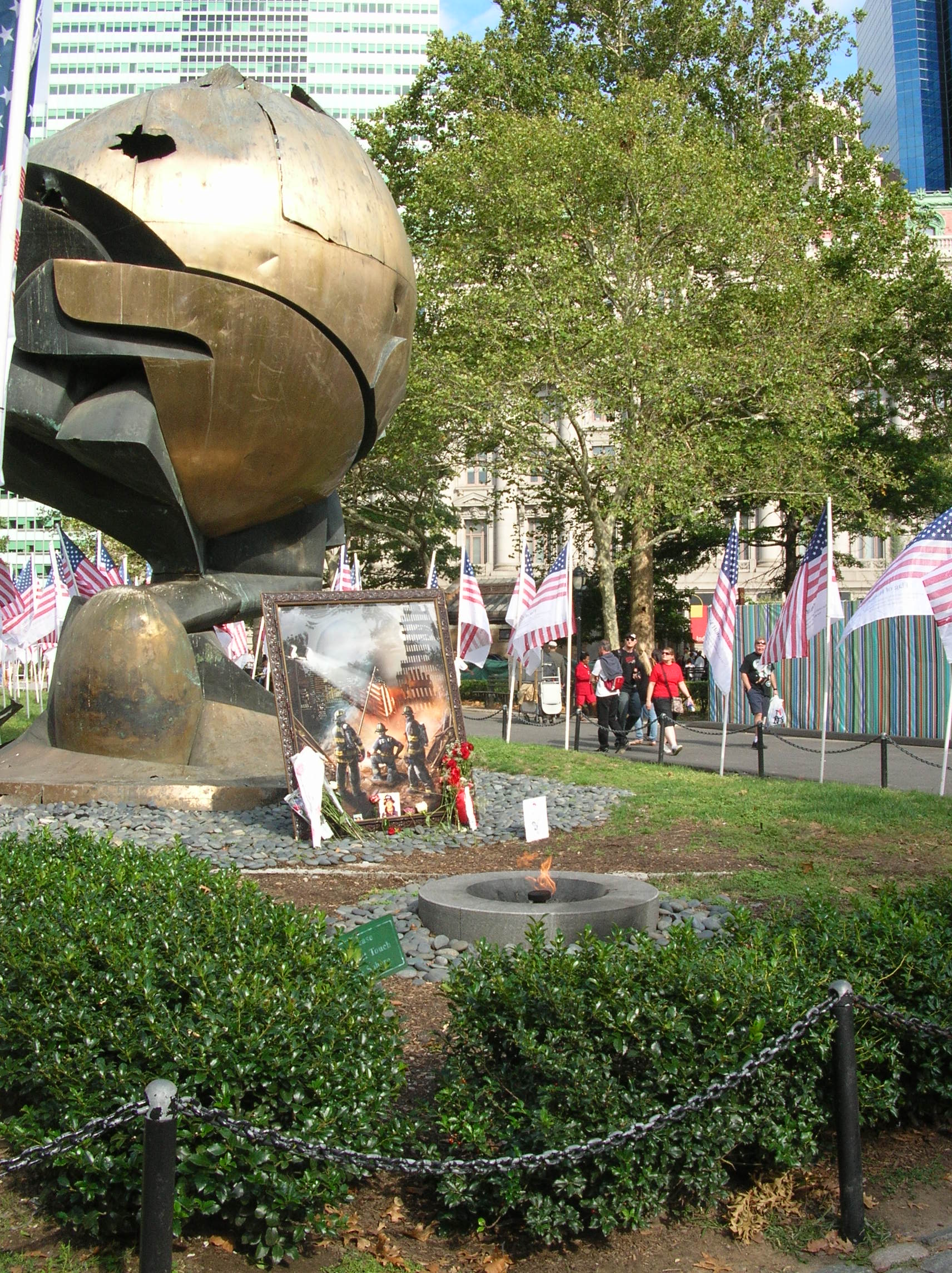 Date/Time: Thu 11 Sep 2008 11:41:16 AM UTC Battery Park, NYC. A memorial to 09/11. There is a steel beam from the wreckage and people were signing it.